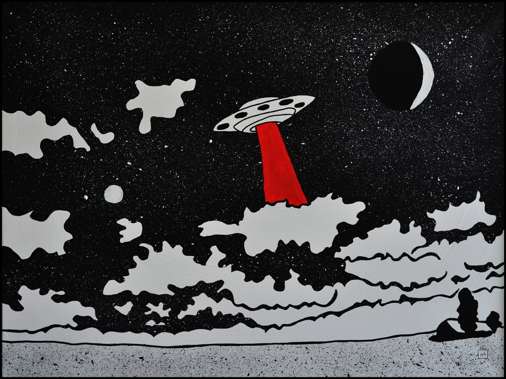 The painting extrapolates that the clouds are generated by the saucer and that they serve to mask its movements. (The next time you see a very cloudy sky, ask yourself the question of the origin of these).