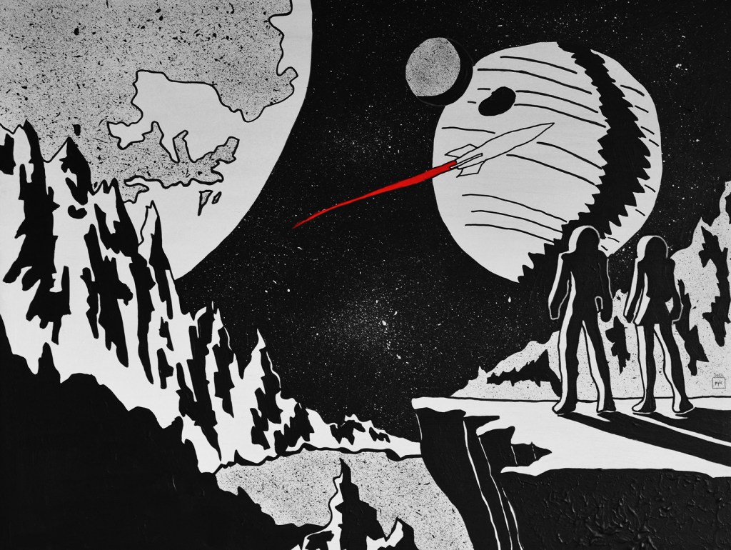 As always with Pyk’s paintings, a certain artistic freedom in the number of planets and configurations of stars is felt. We are on the moon, but we also see pluto, the ninth planet of the solar system for 76 years.
