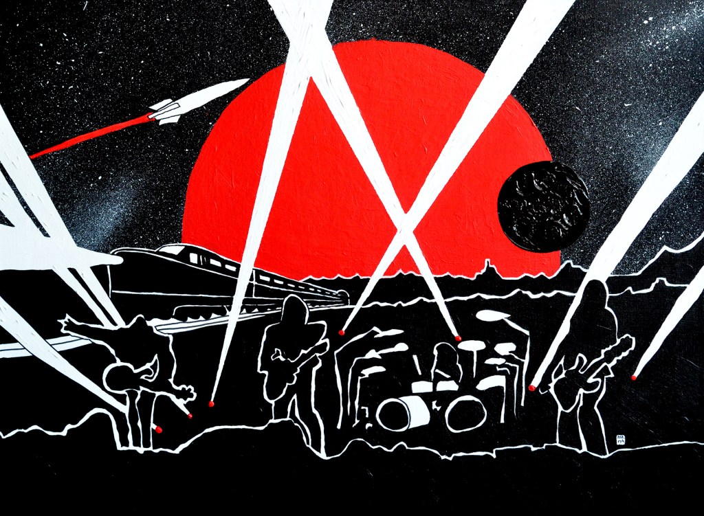 This painting fits well into the series of visions of space (and as always the « codes » of that series are present). The red sun crushes the canvas, as it crushes the men on this planet. Too big, too present…
