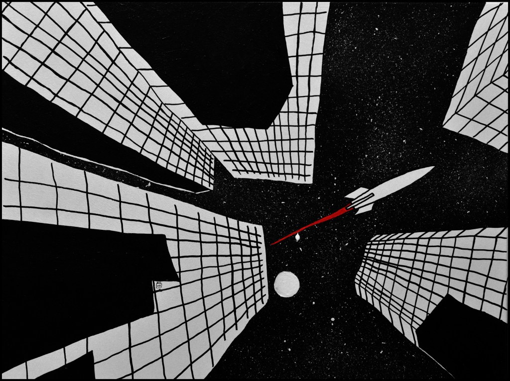Est-ce une ville abandonnée sur une planète lointaine? Une mégapole surpeuplée qui espère beaucoup du début des migrations sur d’autres planètes (et dont la fusée serait une des premières à compter des colons en son sein métallique) ? Ou juste une vue standard d’une cité actuelle?