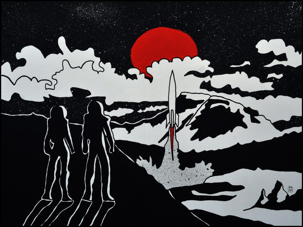 Corolaire de ces conditions particulières ? Il est assez rare de voir le ciel étoilé depuis la colonie. Le tableau représente le départ de la navette pour la terre qui est toujours un moment particulier. Elle assure le contact régulier et le transfert des marchandises indigènes ver la planète mère située à environ 4,2 années lumières. Le ciel étoilé, signature de la série n’est que partiellement visible.