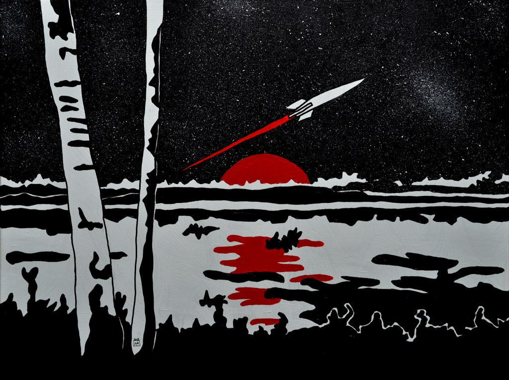 La toile présente le coucher de soleil du 8 octobre 2074. La navette régulière reliant Terre Une à Terre Deux vient de décoller et surplombe le Loch Ness (oui les colons sont nostalgiques).