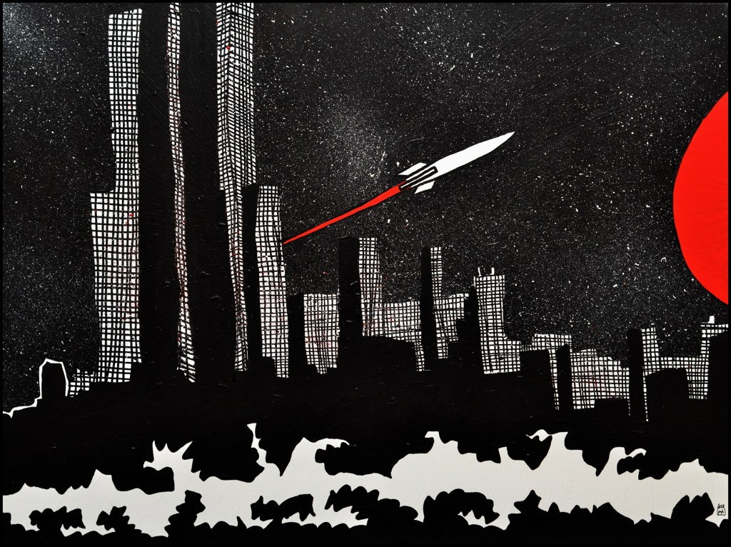 The painting takes up the codes of the series: a rocket from the remote exploration service has discovered a new habitable planet in the Dog constellation. The city it flies over seems to have been abandoned centuries ago. The decrepitude of the buildings is obvious, as is the inexorable advance of the vegetation, and there is no trace of the inhabitants.