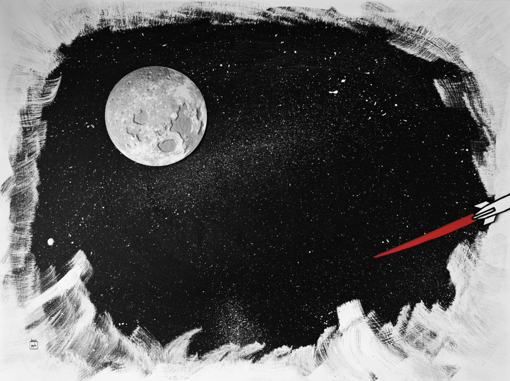 Une toile qui sort du cadre strict de la série « Retour à l’espace ». Le noir de l’espace ne rempli pas la toile… et la fusée en sort. L’univers dispose-t-il de frontières ou est-il infini ?