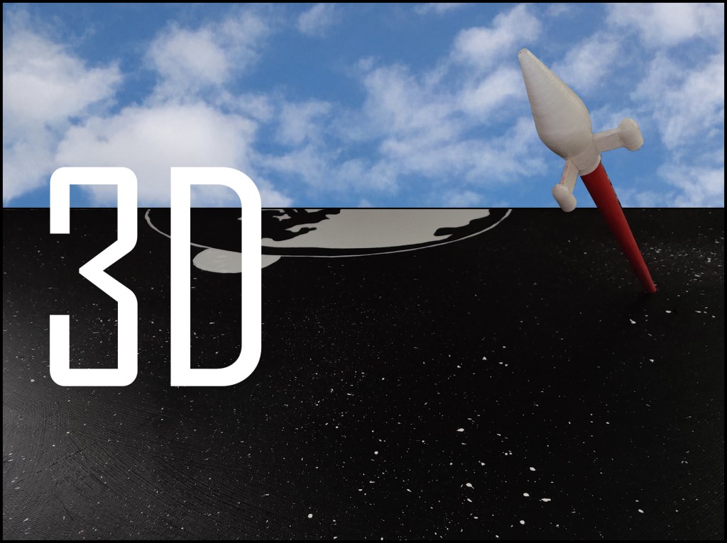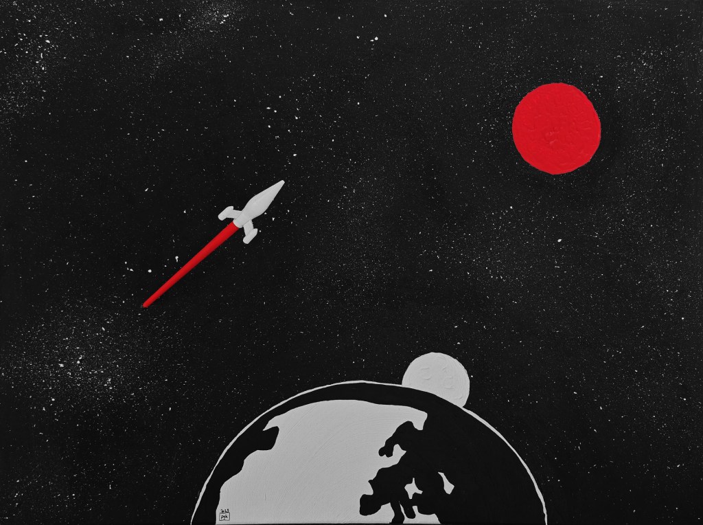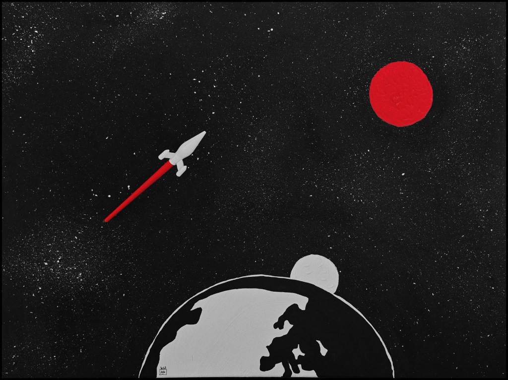 Vue de loin la toile semble être en 2D, la fusée peinte sur le fond de l’espace à proximité de la terre. Quand on s’approche, on découvre qu’elle sort littéralement de la toile, à la découverte de l’univers des personnes qui regardent la peinture. Comme à la recherche d’un autre monde. Et si le voyage vers l’inconnu consistait à passer dans une dimension supérieure et non pas simplement aller plus loin dans l’espace ?