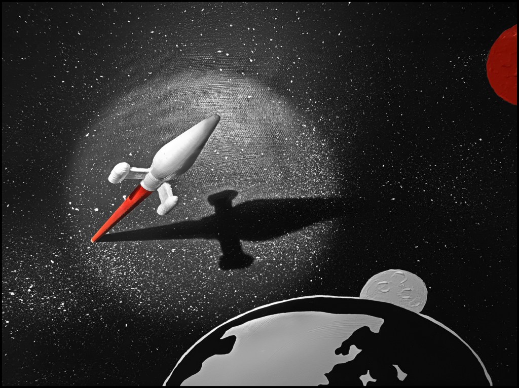 Seen from a distance, the painting appears to be in 2D, the rocket painted on the background of space near the earth. When you get closer, you discover that it literally pops out of the canvas, discovering the world of the people looking at the painting. As if in search of another world. And what if the journey into the unknown involved moving into a higher dimension, rather than simply going further out into space?