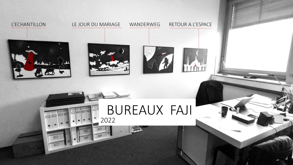 Depuis 2022, des peintures sont mises en prêt dans des bureaux. Pas vraiment une exposition, mais une belle visibilité tout de même. La question d’une vraie exposition se posera lorsque le catalogue comprendra au minimum 25 toiles de dimensions 60 x 80 cm.