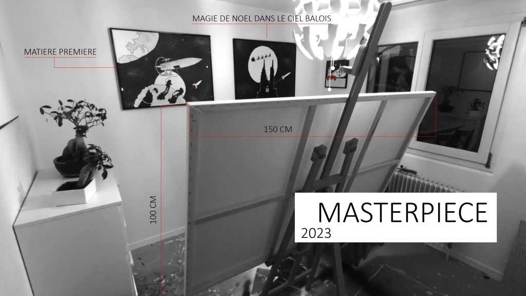 For the first time in 2023, a « giant » canvas will be realized. With its dimensions of 100 cm x 150 cm, the challenge is important… The canvas called « The Pioneers of Wolf 1069b »is finished in spring 2023.